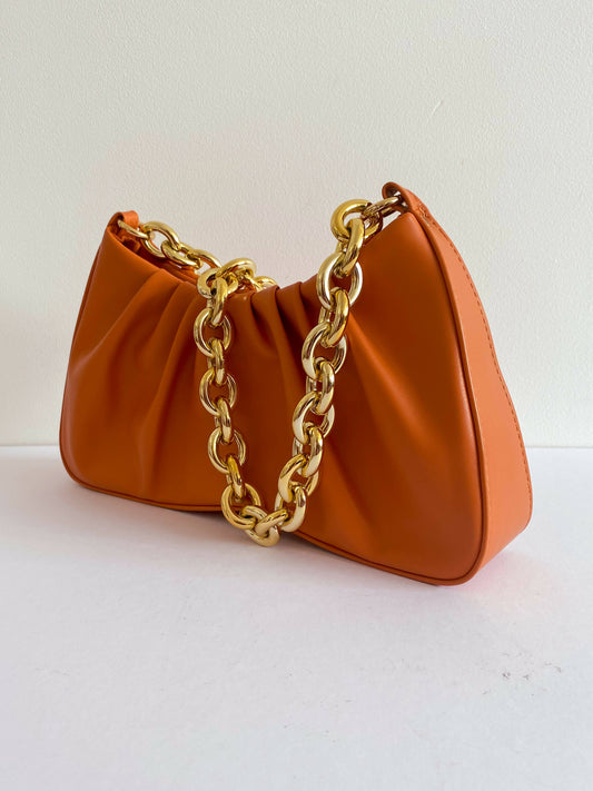 Chain Embellished Burnt-Orange Faux Leather Shoulder Bag
