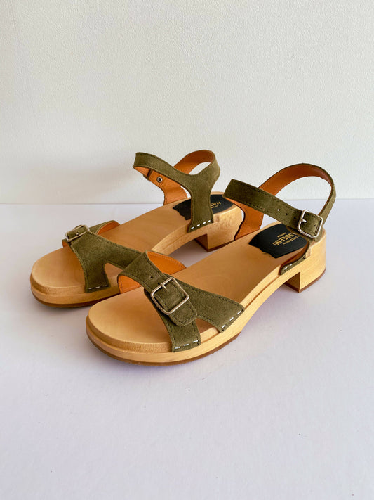 Swedish Hasbeens Size 38 Olive Suede Clogs