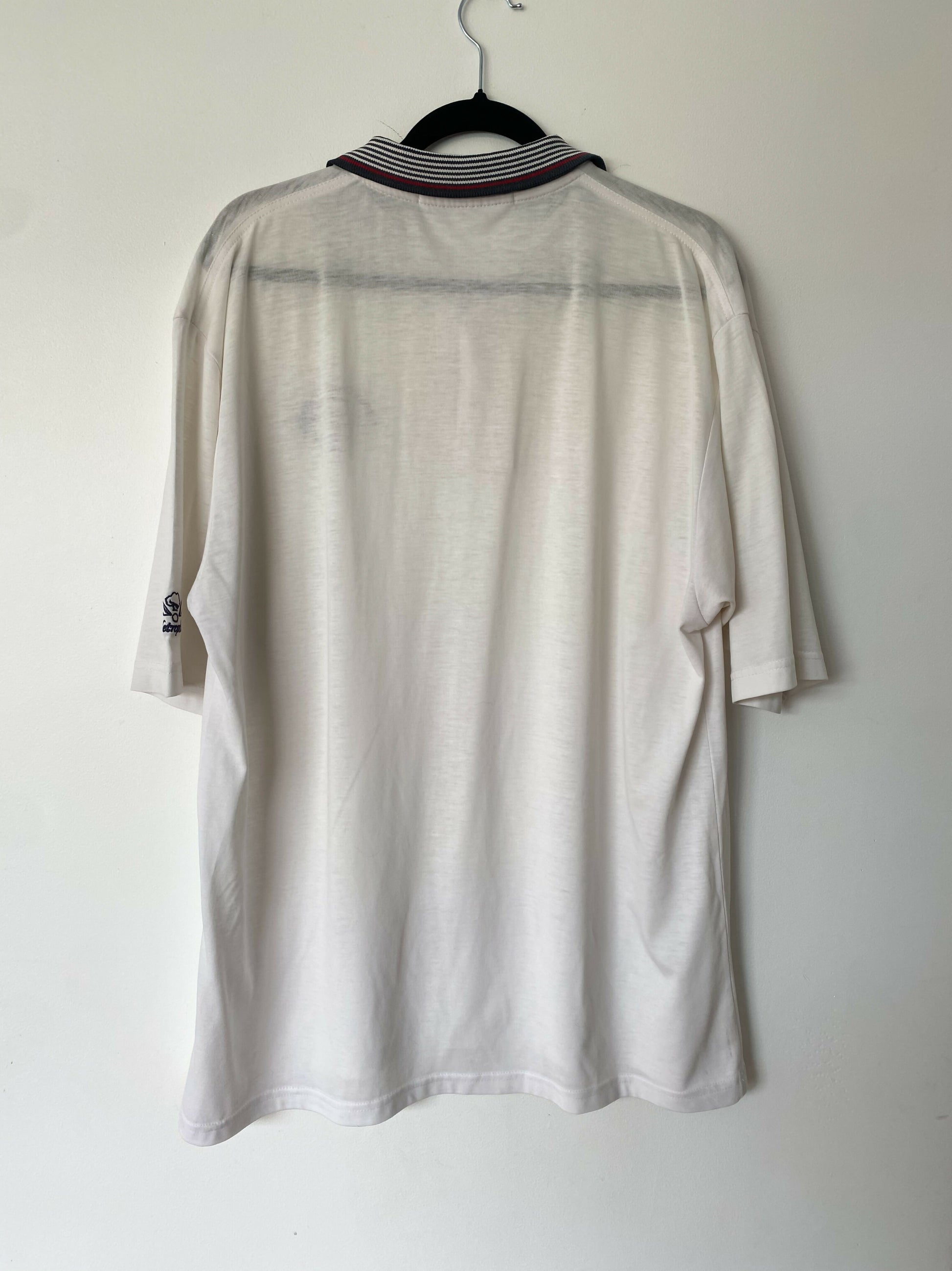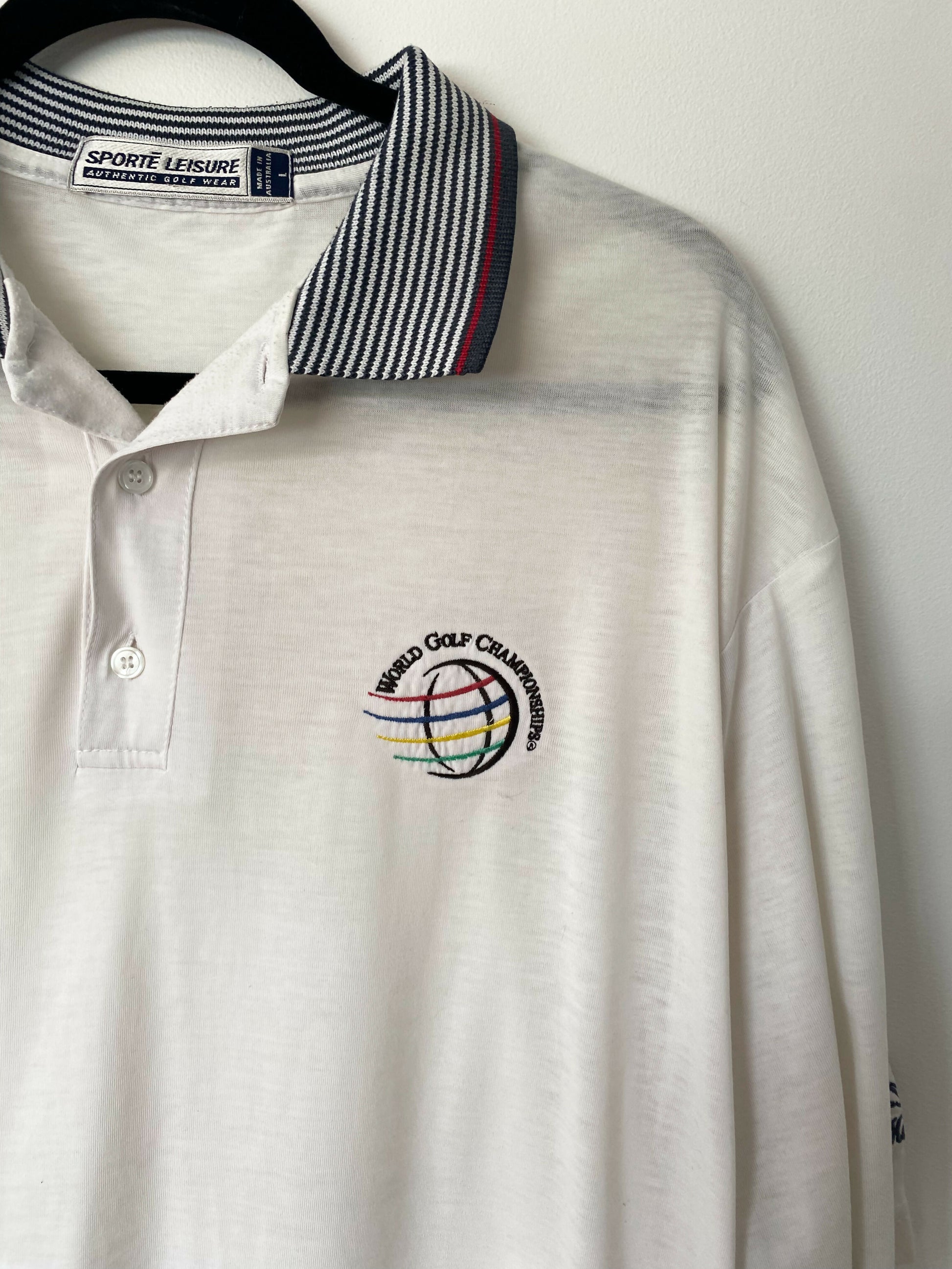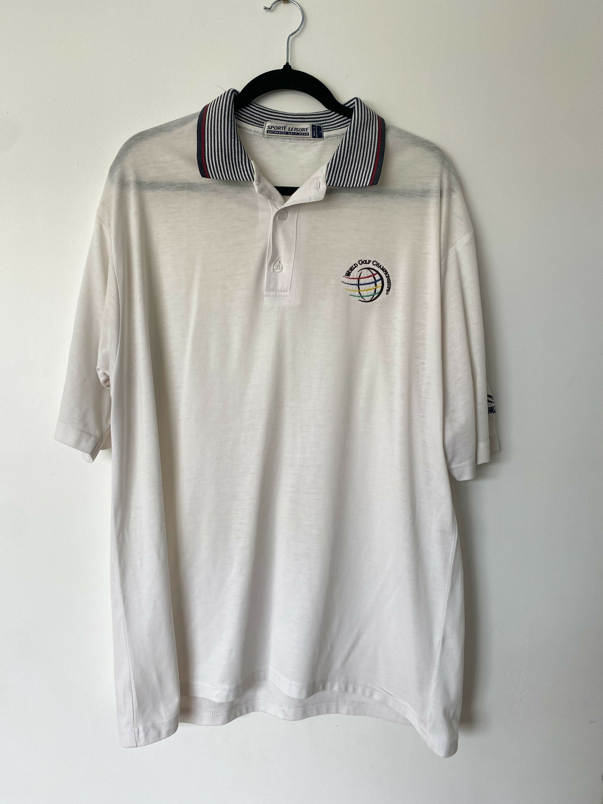 Vintage men's Sport Leisure polo with contrasting stripe collar and logo crest.