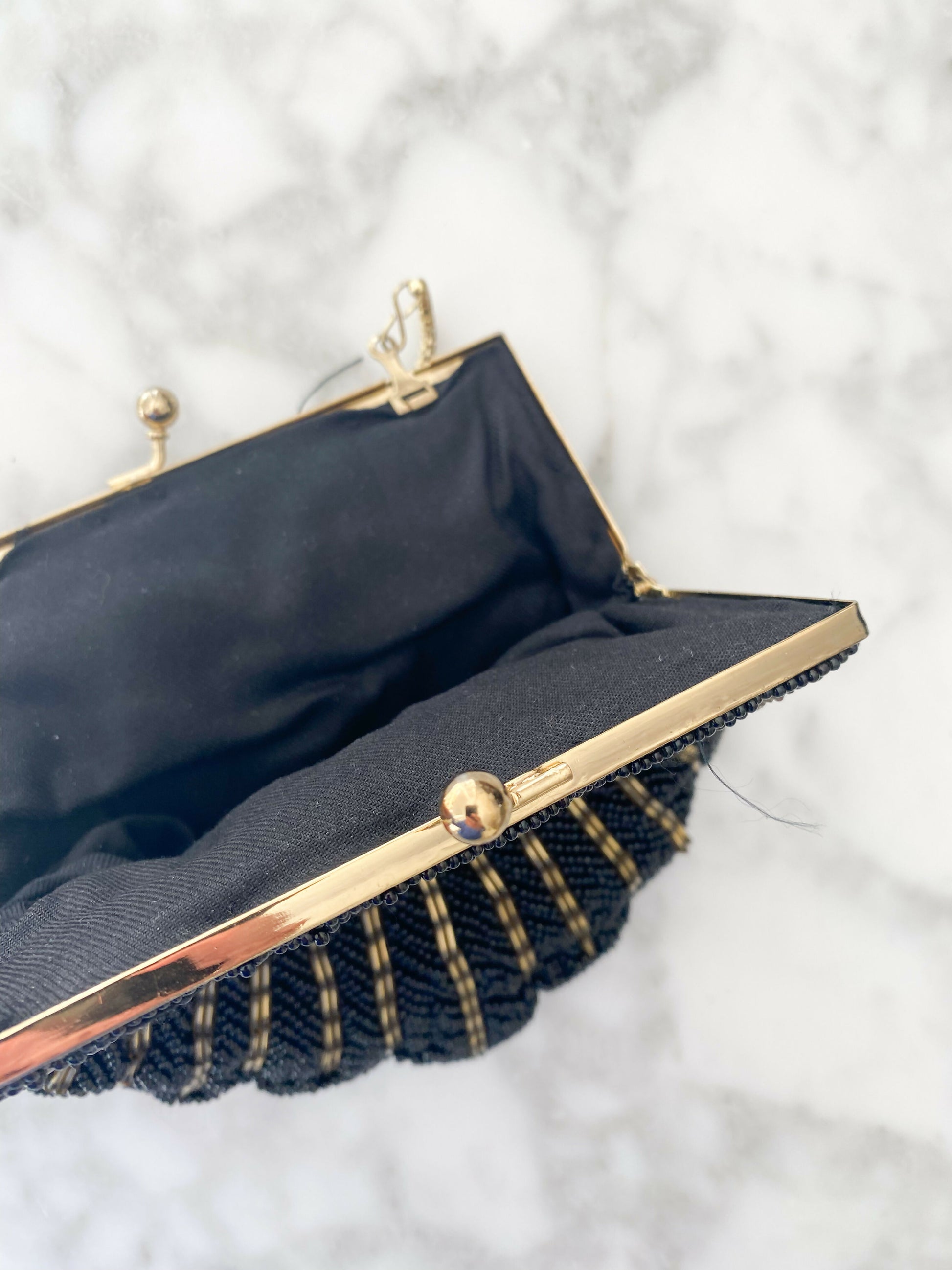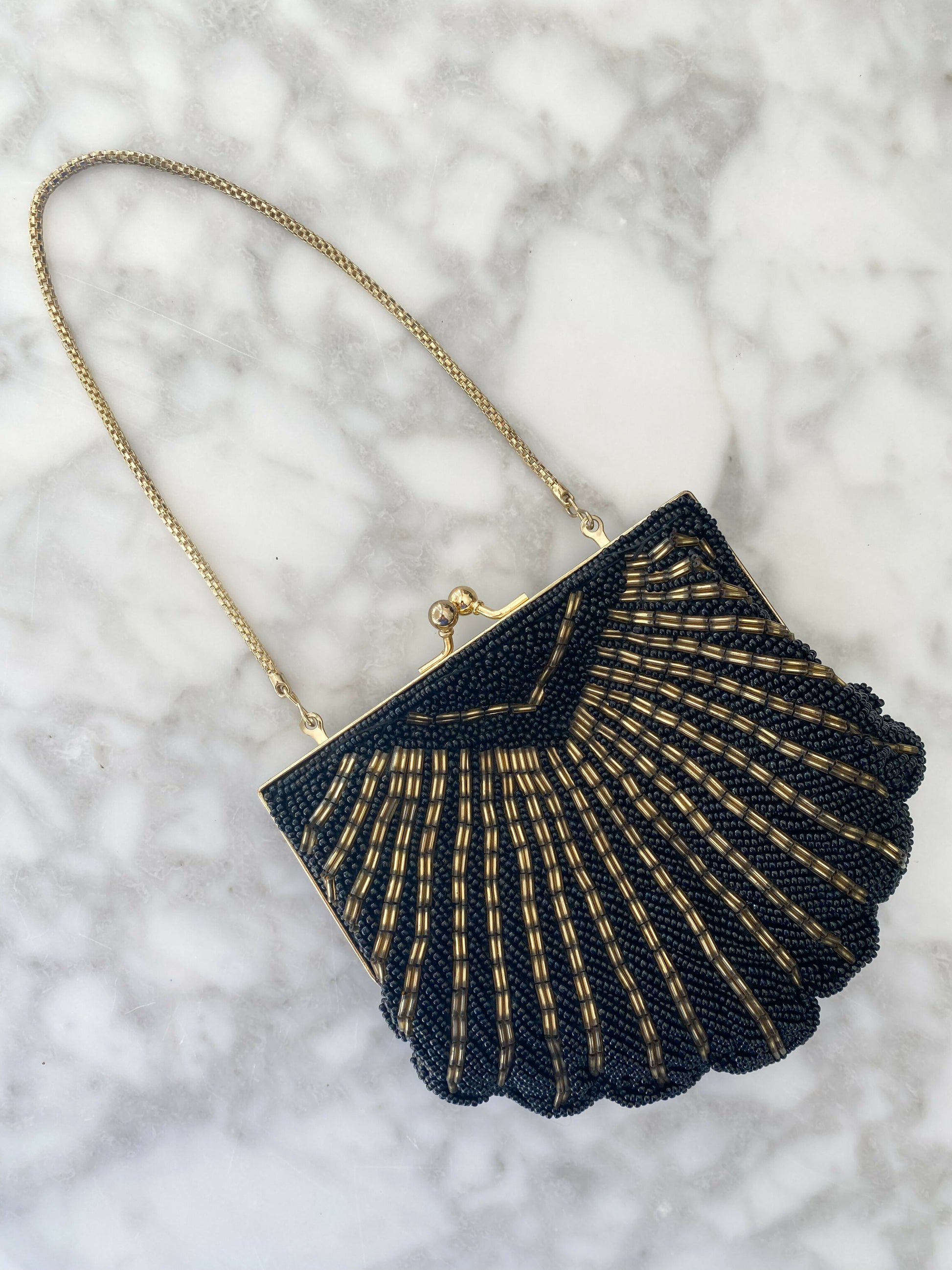 In a fabulous shell silhouette that practically screams '30s thirst trap, this vintage bag is intricately embellished with black and gold-tone beads and finished with an optional chain strap.