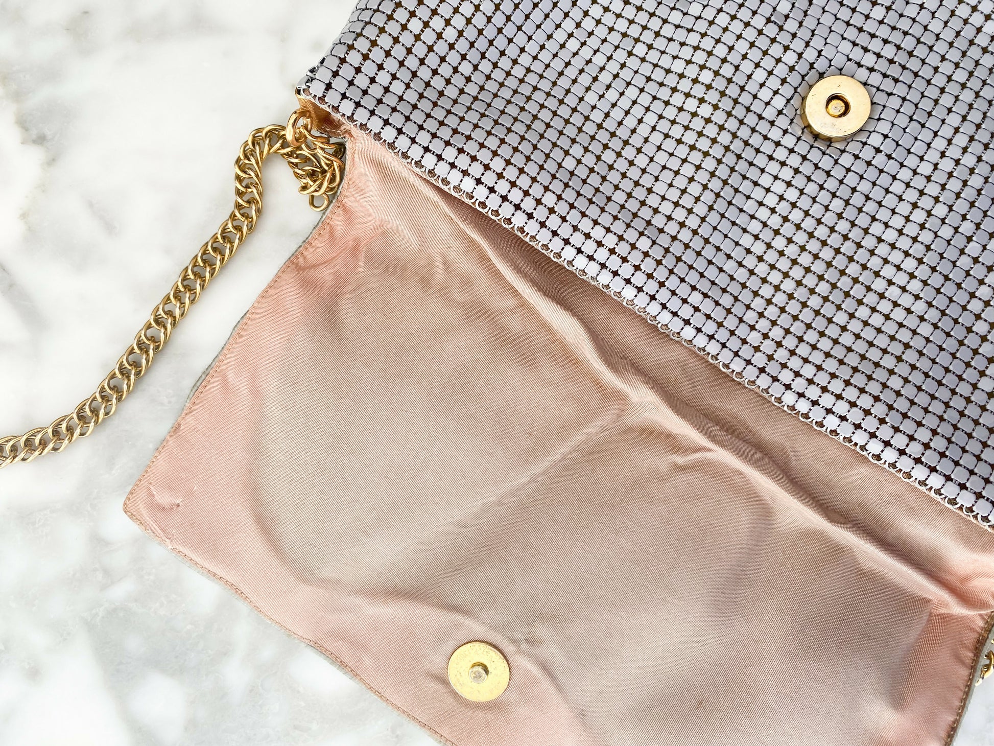 In a cool light-grey hue that feels so current, this vintage Park lane bag is made from slinky chain mail and finished with a gold-tone strap.